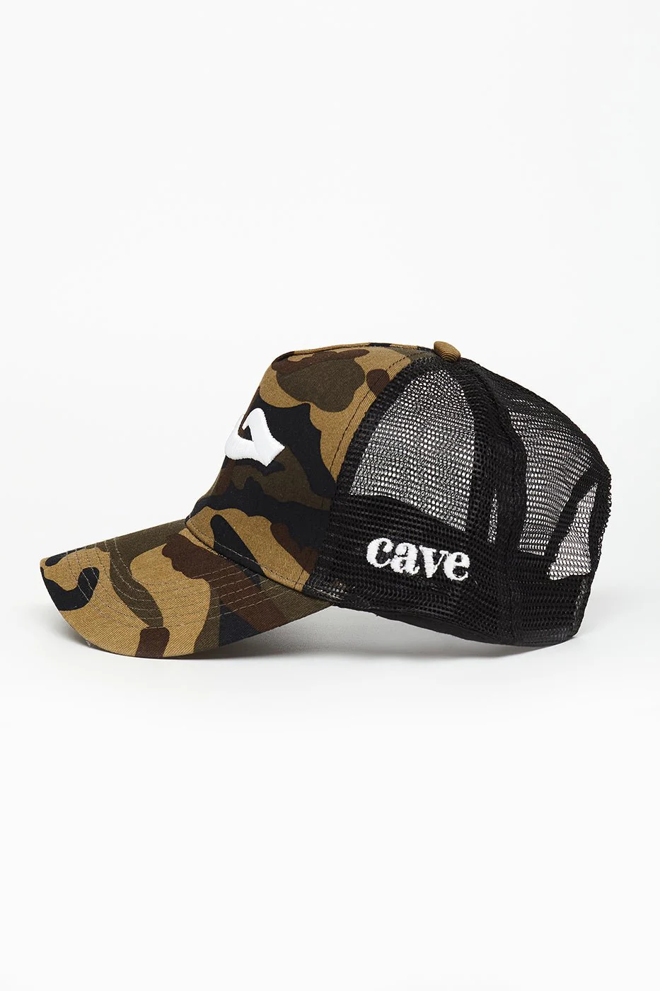 The Love text in Arabic - a camouflage print on a baseball trucker cap with the original Cave logo featured on the side. As worn by Tom Hardy.